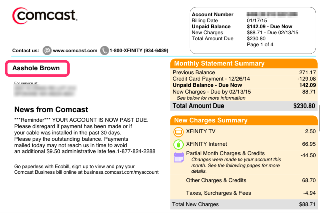 A customer service rep changed the name on Ricardo Brown's bill to Assh*le Brown after he terminated his cable TV service.